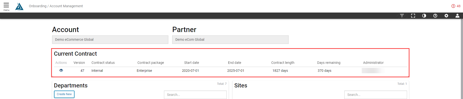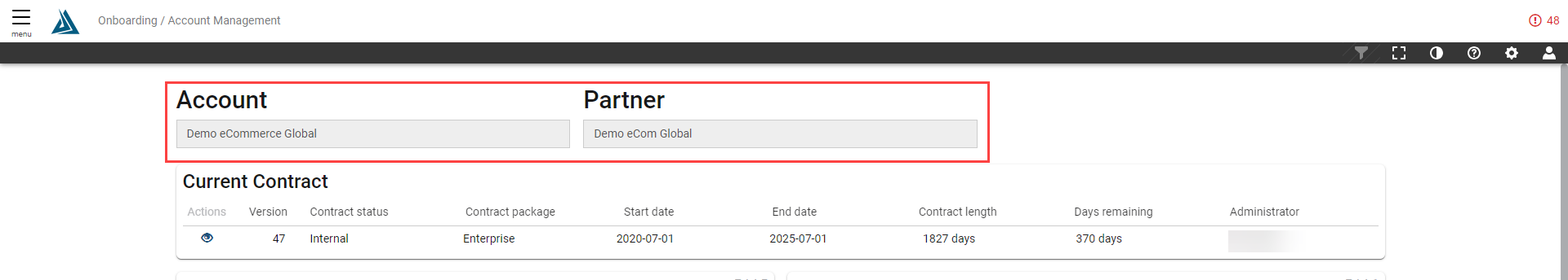 Next are contract details including the version, contract package, start date, end date, contract length, days remaining, and administrator. Click the eye icon under actions on the left to view the contract.