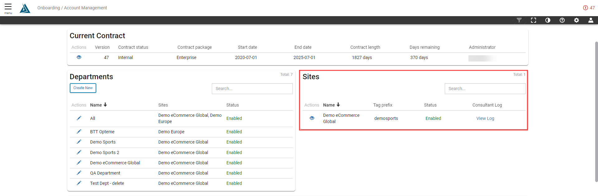 Departments are found next in the page, including the sites in the department and it's status. Click on the pencil icon next to the department name to edit the department.